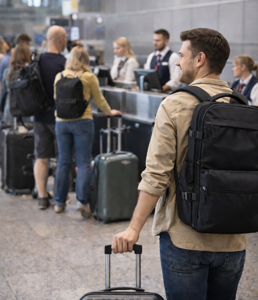 Mit VacuMax ersetzt du dein Aufgabegepäck durch einen kompakten Handgepäck-Rucksack und sparst bei jedem Flug Zeit und Geld.